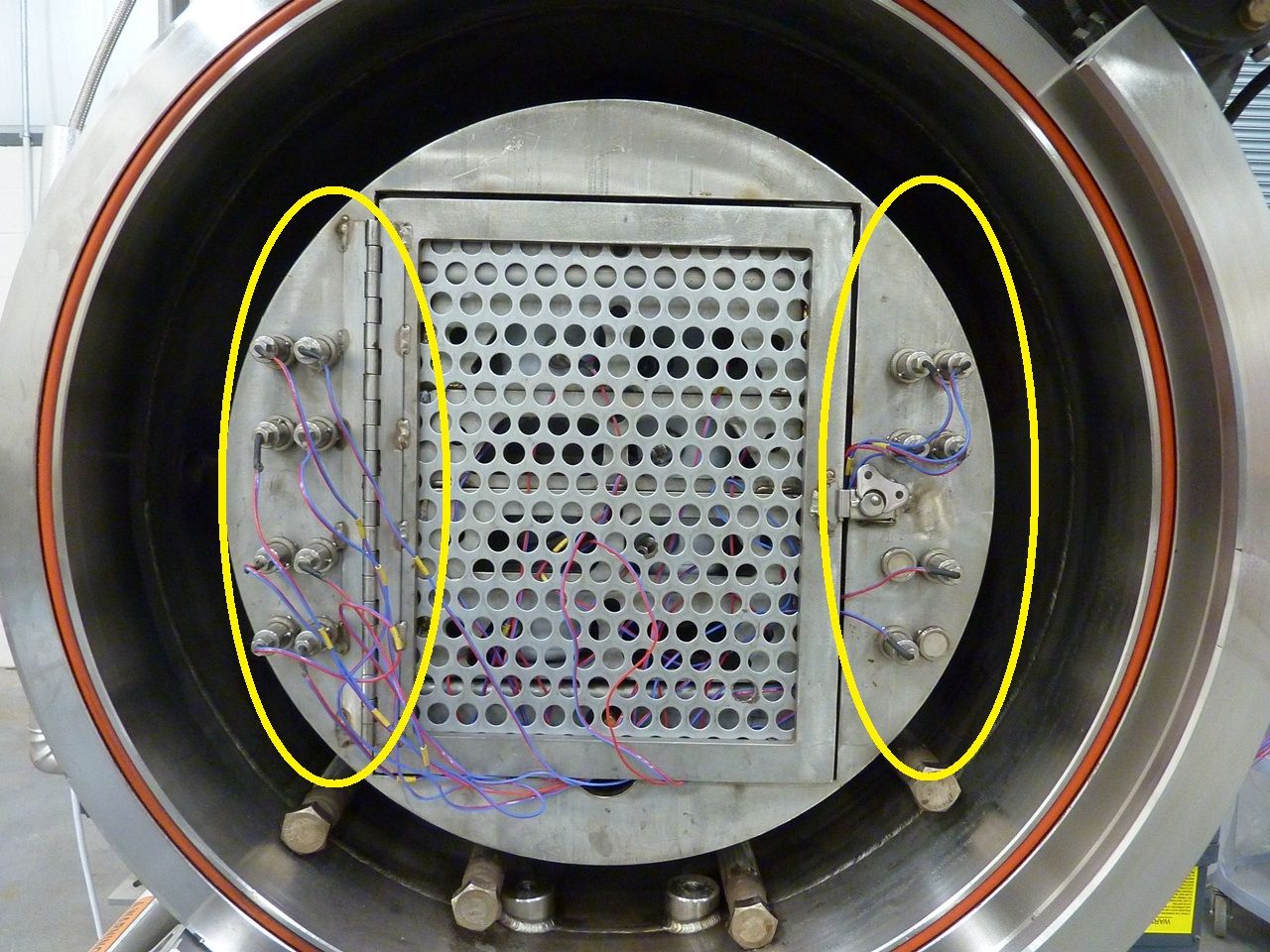 Surface Mount Connectors (S30's) can be installed into the connection panel inside a pilot retort. The panel allows for 16 S30's to be mounted on it. The wires attached to the S30's run through the rotor and out the back of the retort, where the Subminiature Connectors plug into the Rotary CALPlex mounted on the retort. Male Thermocouple Connectors can connect to the S30's on the panel.